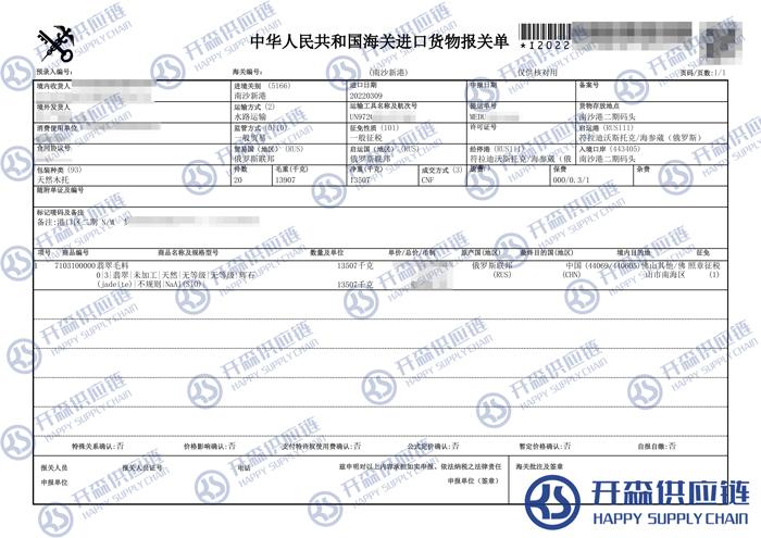 開森進口供應鏈擁有豐富的翡翠毛料進口報關操作經(jīng)驗及案例,十余年操作經(jīng)驗及案例可供參考,可按需定制翡翠毛料進口方案,幫助客戶解決進口難題,快速進口清關到港到貨。