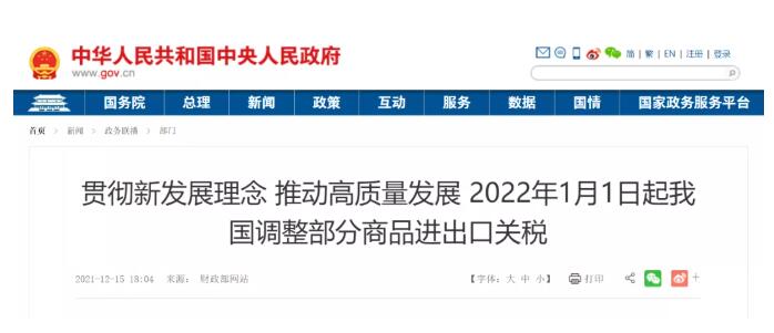 經(jīng)國務(wù)院批準,國務(wù)院關(guān)稅稅則委員會印發(fā)通知,2022年將調(diào)整部分商品的進出口關(guān)稅。為完整、準確、全面貫徹新發(fā)展理念,支持構(gòu)建新發(fā)展格局,繼續(xù)推動高質(zhì)量發(fā)展,經(jīng)國務(wù)院批準,國務(wù)院關(guān)稅稅則委員會印發(fā)通知,2022年將調(diào)整部分商品的進出口關(guān)稅。