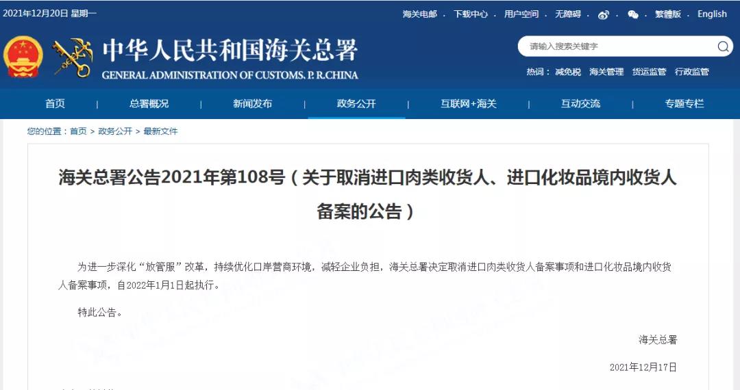 2021年12月17日,海關(guān)總署發(fā)布2021年第108號公告:為進一步深化“放管服”改革,持續(xù)優(yōu)化口岸營商環(huán)境,減輕企業(yè)負擔(dān),海關(guān)總署決定取消進口肉類收貨人備案事項和進口化妝品境內(nèi)收貨人備案事項,自2022年1月1日起執(zhí)行。