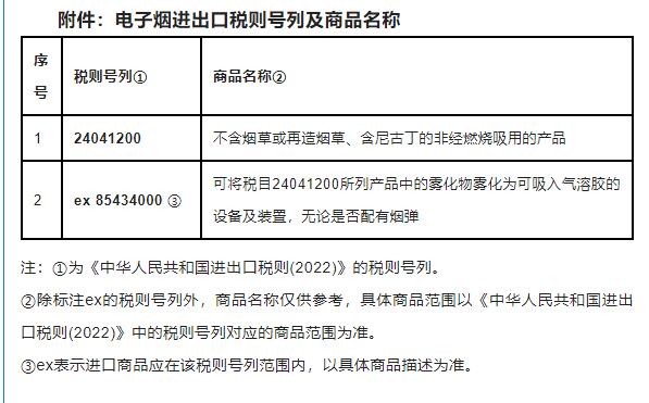 電子煙進(jìn)出口稅則號(hào)列及商品名稱見(jiàn)附件。