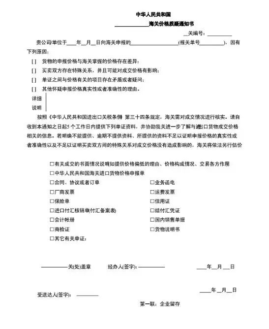自收到《海關(guān)價(jià)格質(zhì)疑通知書》之日起5個(gè)工作日內(nèi),以書面形式提供相關(guān)資料(如提供價(jià)格偏低的理由、價(jià)格構(gòu)成情況、交易各方作用的情況說明,《中華人民共和國海關(guān)進(jìn)出口貨物價(jià)格補(bǔ)充申報(bào)單》,合同、協(xié)議或者訂單,業(yè)務(wù)函電,廠商發(fā)票,運(yùn)費(fèi)發(fā)票,保險(xiǎn)單,結(jié)付匯憑證,貨物說明書等),以證明其申報(bào)價(jià)格真實(shí)、準(zhǔn)確或買賣雙方之間的特殊關(guān)系未影響成交價(jià)格。