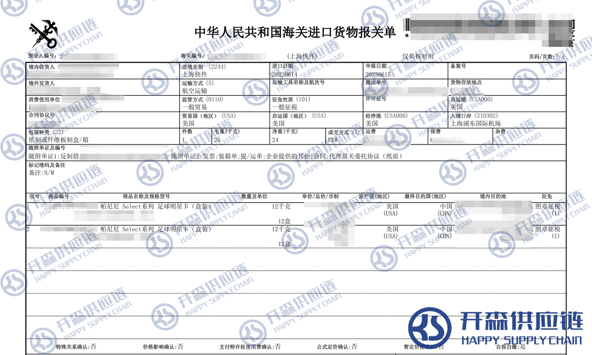 開森進(jìn)口供應(yīng)鏈擁有球星卡進(jìn)口報關(guān)操作經(jīng)驗及案例,十余年操作經(jīng)驗及案例可供參考,可按需定制球星卡進(jìn)口方案,幫助客戶解決進(jìn)口難題,快速進(jìn)口清關(guān)到港到貨。