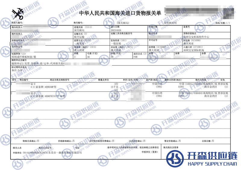 開森進(jìn)口供應(yīng)鏈擁有高端顯卡進(jìn)口報(bào)關(guān)操作經(jīng)驗(yàn)及案例,十余年操作經(jīng)驗(yàn)及案例可供參考,可按需定制高端顯卡進(jìn)口方案,幫助客戶解決進(jìn)口難題,快速進(jìn)口清關(guān)到港到貨。