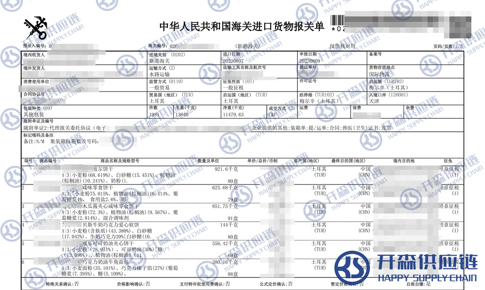 【本文結(jié)語】 上述就是天津港土耳其餅干進口報關代理服務【清關案例】的全部內(nèi)容,希望能對您有所幫助,如有餅干進口報關上任何疑問及問題可隨時在線聯(lián)系我們或撥打 18002611553,開森供應鏈擁有豐富的餅干進口報關操作經(jīng)驗及案例,10余年進口經(jīng)驗為您所用,各類進口疑難都能為您一一解答及協(xié)助快速處理解決!