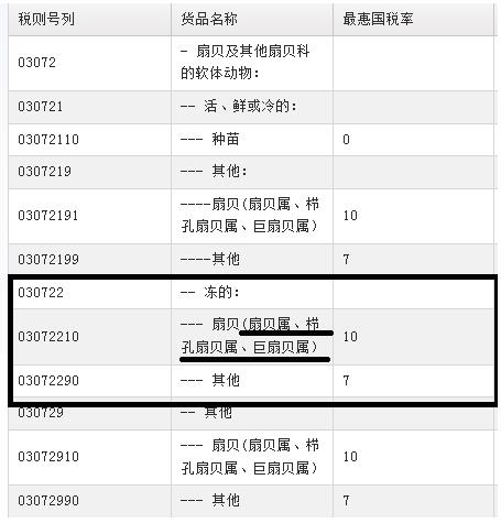 其中根據(jù)貨物不同的保存狀態(tài)(“活、鮮或冷的”“凍的”“其他”)歸入不同的二級子目項下,這點比較容易區(qū)分,如何選擇正確的本國子目則比較難以區(qū)分。以進(jìn)口量最大的“冷凍蝦夷貝”為例,在日常申報實際中,03072210和03072290均有申報,兩者最惠國稅率分別為10%和7%,如果不能正確歸類,給海關(guān)監(jiān)管以及稅收征管都會帶來不利影響,企業(yè)也會面臨通關(guān)延誤、被后續(xù)稽查甚至處罰的風(fēng)險。
