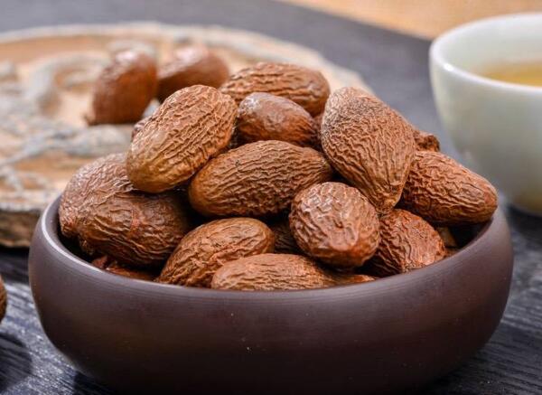 胖大海別名:大海、大海子、大洞果、大發(fā),梧桐科植物胖大海的干燥成熟種子。呈紡錘形或橢圓形,長2~3cm,直徑1~1.5cm。先端鈍圓,基部略尖而歪,具淺色的圓形種臍,表面棕色或暗棕色,微有光澤,具不規(guī)則的干縮皺紋。外層果皮極薄,質(zhì)脆,易脫落。中層果皮較厚,黑褐色,質(zhì)松易碎,遇水膨脹成海綿狀。斷面可見散在的樹脂狀小點(diǎn)。內(nèi)層果皮可與中層果皮剝離,稍革質(zhì),內(nèi)有2片肥厚胚乳,廣卵形;子葉2枚,菲薄,緊貼于胚乳內(nèi)側(cè),與胚乳等大。氣微,味淡,嚼之有黏性。